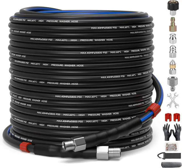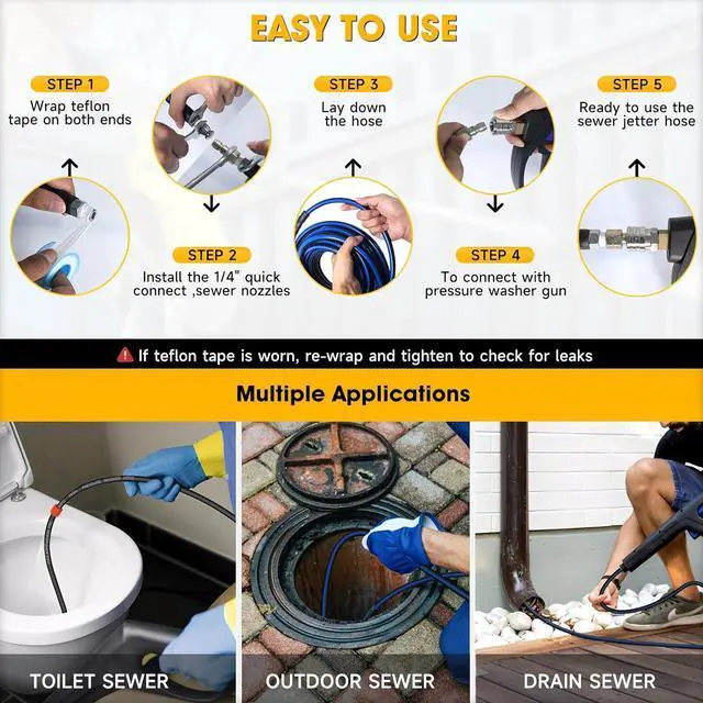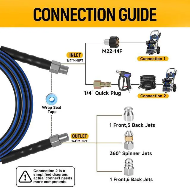 Complete Toolkit - The pressure washer jetter kit includes a complete toolkit with 2 wrenches, 1 telfon tape, 1 marking ringCalculate the blockage distance, make sure blockage location1 box of pearl corsage pin, 1 M22-14F connector (Connection-1 for the pressure washer), and a 1/4" quick connect (Connection-2 for the pressure washer gun), making it easy to use