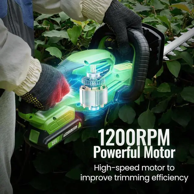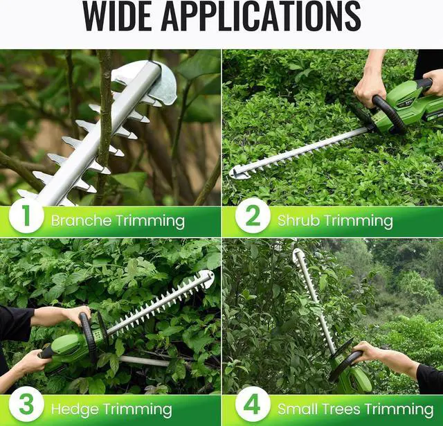 Safety: This electric handheld hedge trimmer cordless weighs only 4.34 LBS, which reduces arm fatigue during long-term use. Double switch prevents accidental start-up, ensuring safe operation for beginners and professionals