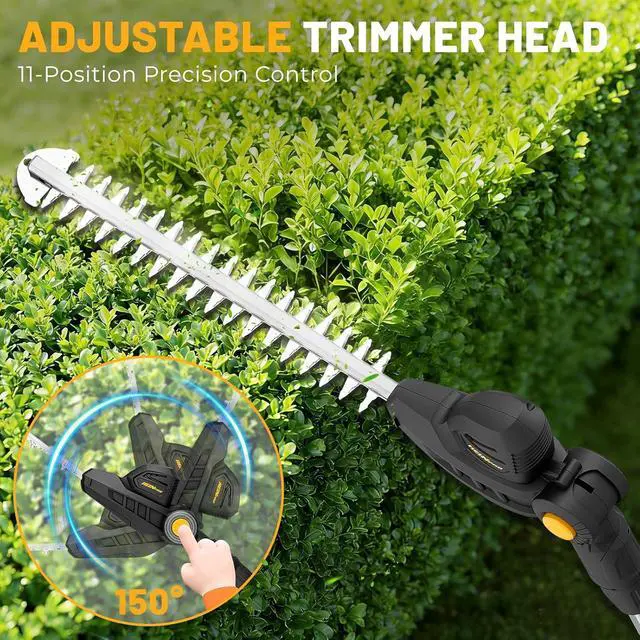 [150° Multi-Angle Cutting Head] This cordless pole hedge trimmer features preset locking positions across a full 150° range, enabling you to swiftly and securely select the ideal angle for each task. This design ensures precise, versatile trimming from multiple orientations, making it an efficient electric pole hedge trimmer for expertly shaping bushes and hedges.