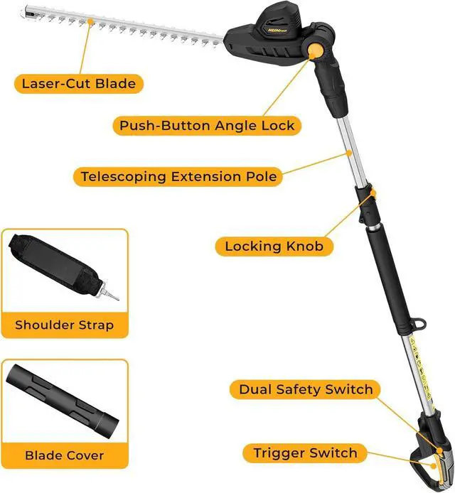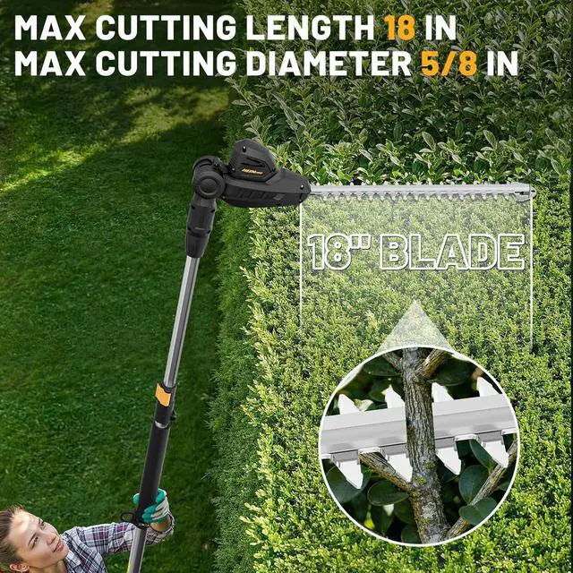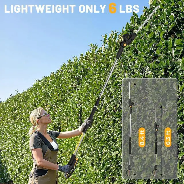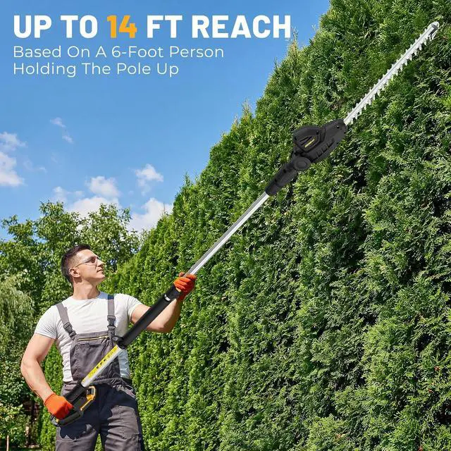 [Extends Reach Up to 14 Feet] This extendable pole hedge trimmer includes a telescoping extension pole, providing an 8.4 -foot operational reach. For a 6-foot user operating at shoulder height on level ground, it achieves a maximum cutting height of 14 feet (actual height may vary with posture). Perfect as a pole trimmer for high hedge trimming.