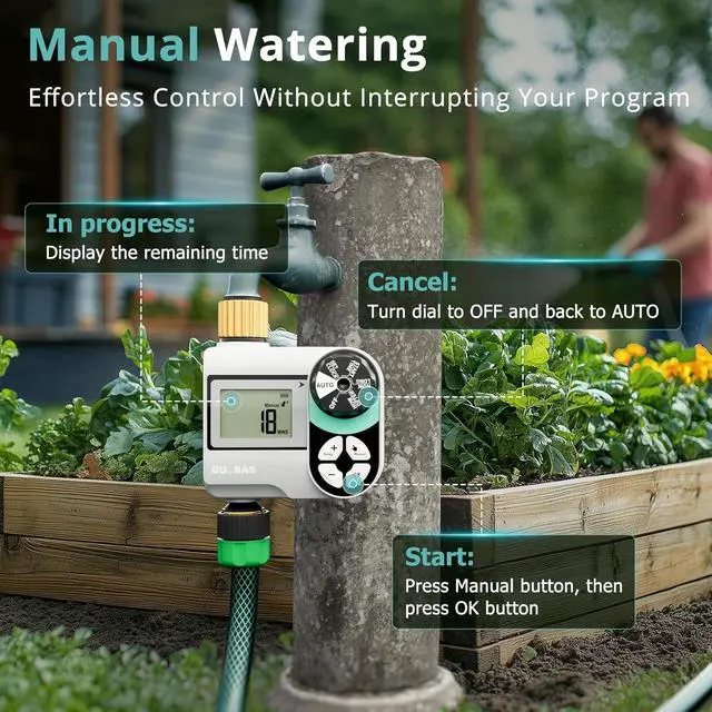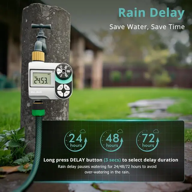 Rain Delay & Water-Saving Automation: Maximize efficiency with the intelligent Rain Delay feature (24/48/72 hours). This automatic watering system function allows you to pause cycles during wet weather, protecting plants and saving water without disrupting your programmed watering schedules. Its a good choice for water-wise gardening, drip system management, and maintaining a healthy landscape or yard