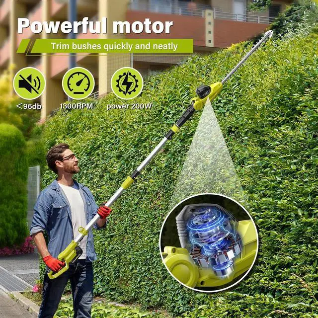 Ajustable Trimmer HeadThe pole trimmer is adjustable from 0-135° with 6 positions to easily trim branches at any angle; it can easily trim high branches, side branches and low shrubs, and it helps you to flexibly operate the hedge trimmer in any direction