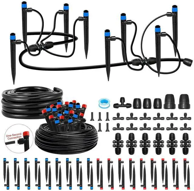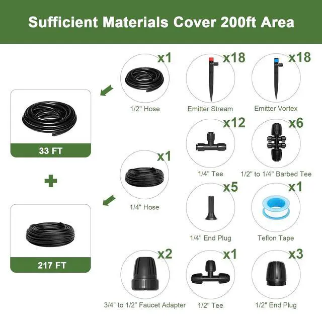Rich Accessories -Budget FriendlyOur drip irrigation kit includes 33FT 1/2"hose×1, 217FT1/4"hose×1, Emitter Vortex×18, Emitter Stream×18, 1/2"Tee×1, 1/4"Tee×12, 1/2"to1/4"Barbed Tee×6, 1/4"End Plugx5, 1/2"End Plug×3, 3/4"to1/2"Faucet Adapterx2, Teflon Tape×1, abundant accessories makesit adaptable to your various requirements. And 233ft hose can even cover 200ft area.