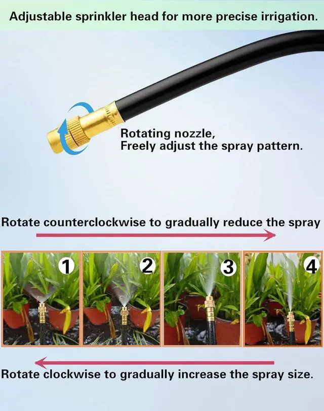 360° Rotation & Adjustable Spray Patterns Experience unparalleled watering flexibility with our garden sprinkler. Its 360° rotating nozzle provides effortless, all-angle coverage for your entire garden. Simply turn the nozzle with your fingers to easily adjust the water flowchoose from a gentle mist that won't disturb soil or delicate seedlings to a steady, solid stream for deep root watering. This versatility ensures that everything from delicate flowers and potted plants to larger lawn areas receives the ideal amount of water.
