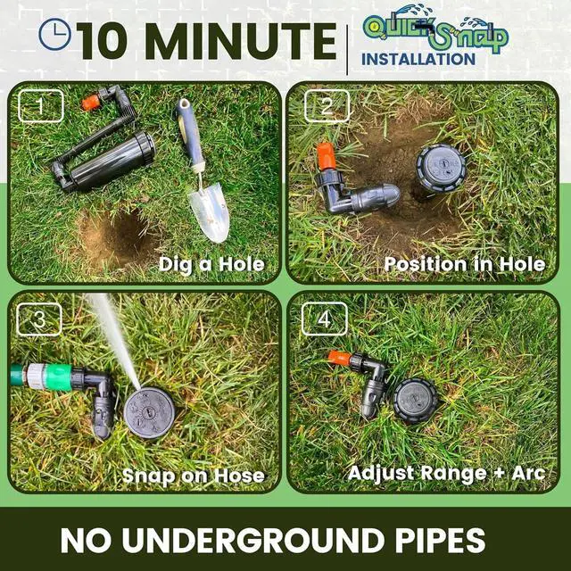 • Snap on hose from any direction and water up to 5000 square feet each