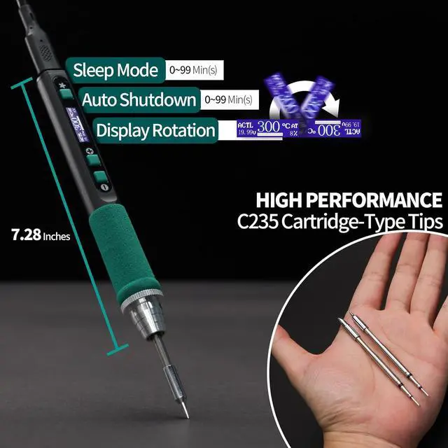 Complete Soldering iron Kit: Includes a soldering iron with Type-C port; a tool bag for easy carry, fast-heating C235-I/ 3.2D /SI cartridge tip; Type-C cord (59 inches); Type-C plug adapter (Black or White), soldering iron stand, solder wire (10g, 0.8 mm)