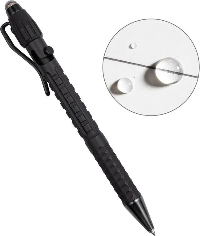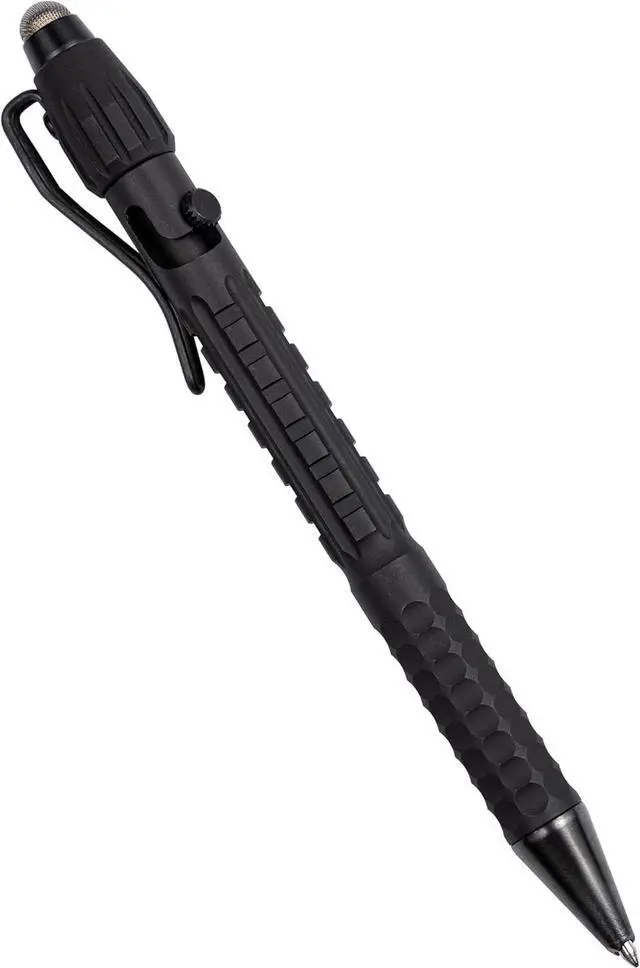 Our best-selling tactical pen, now with stylus support! The conductive mesh stylus tip works on modern technology and wont scratch the screen of your devices. The opposite end includes a glass-breaking tip for getting out of tough situations. A premium machined barrel features a textured grip that works with and without gloves and in any weather condition. Writing-first design garners attention and makes for a great every day carry. The pressurized cartridge allows you to write through water, grease, and mud and at any angle, even upside down. When everything goes wrong, trust your pen.