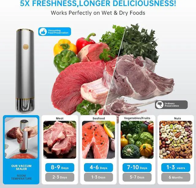 Extended Battery Life 2x Capacity for Longer UseOur vacuum sealer comes with a built-in high-capacity lithium battery that lasts twice as long as most competing models. Youll enjoy extended usage time on a single chargeideal for large batch sealing, camping, or travel. With superior energy efficiency, this vacuum sealer for food ensures powerful performance and reliability, anytime and anywhere.