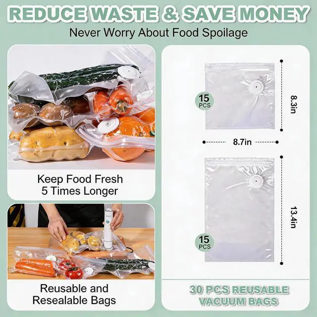 Complete Starter KitIncludes 30 BPA-free vacuum bags so you can start sealing right away. Works with most standard vacuum seal bags. 15pcs ( 8.5 x 8.5 inch)+15pcs( 8.5 x 13.5 inch).