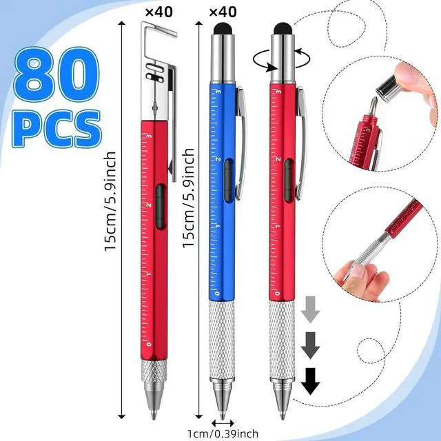 Tool Pens: the multitool pen measures about 5.9 inch/ 15 cm, providing a comfortable grip and impeccable writing, and features a ballpoint pen for jotting down notes, a stylus for use, a ruler for quick measurements, a flathead screwdriver, a Phillips head screwdriver, and a level for precise measurements