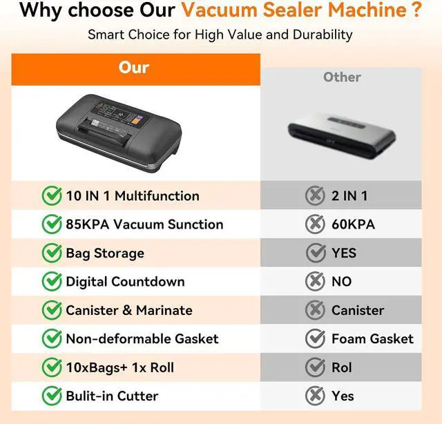 Continuous Run & Built-In Convenience: Powered by an advanced cooling system, this vacuum sealer machine can run continuously without overheating. Perfect for sealing large batches. The built-in bag cutter and roll storage let you create and seal custom bags in one smooth workflow