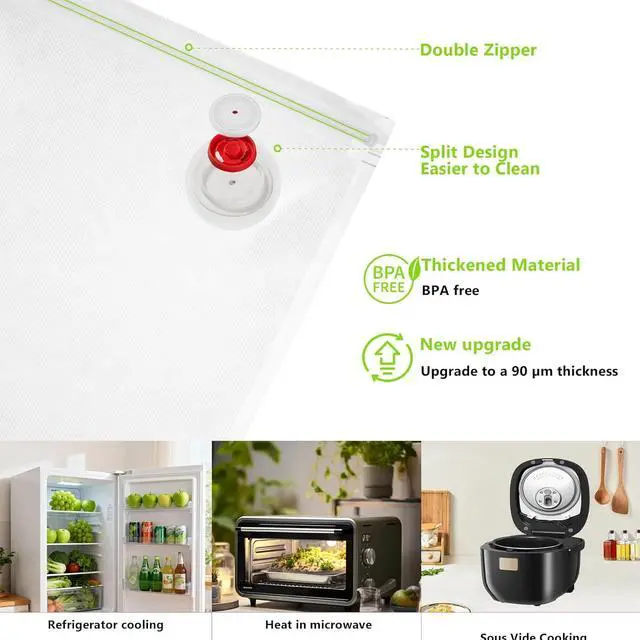 Upgraded 90um Thickness, Triple-Layer Design The vacuum bags feature a 90um thickness and a triple-layer design for increased durability. The interior surface includes embossed textures for smoother air removal. The top seal and three-layer air extraction valve ensure a long-lasting airtight seal to keep your food fresh for longer.