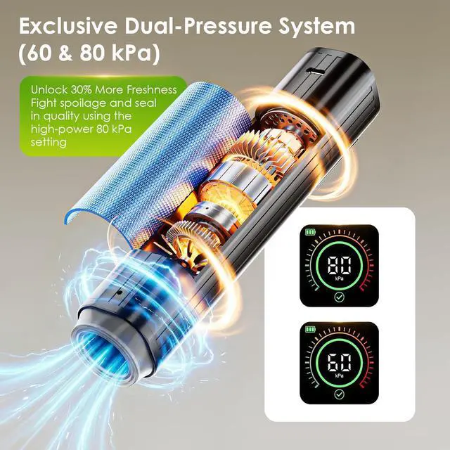 5X Longer Freshness with Smart Pressure Control 's exclusive LED pressure display guides you to choose between 60kPa (delicate foods) and 80kPa (meats)