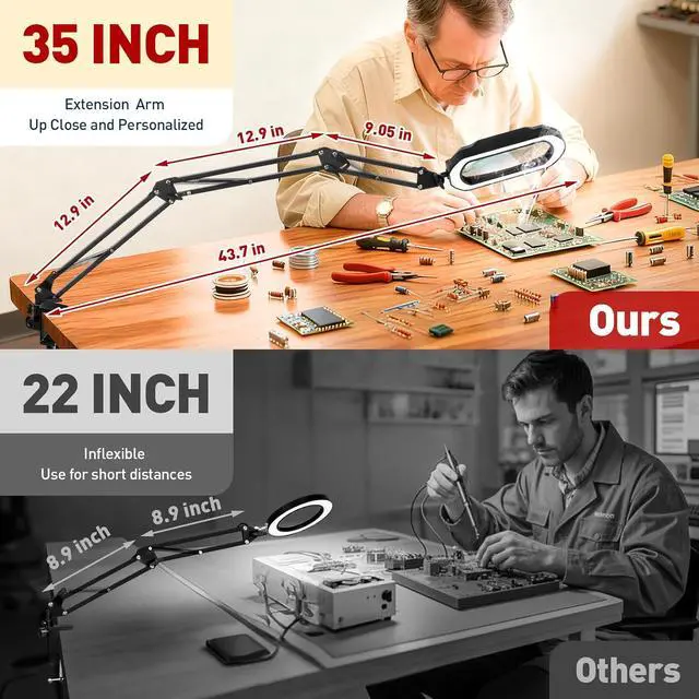 EXTRA-LONG THREE-SECTION ARM: One of the standout features of our magnifying glass with light and clamp is its 35-inch extra-long reach, allowing it to function not just as a magnifying desk lamp but also as an overhead task light. The swing arm is supported by 6 springs and 4 knobs and provides excellent flexibility for positioning over large workbenches and varied projects