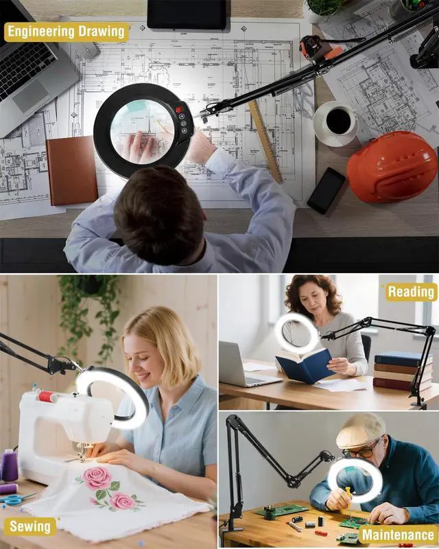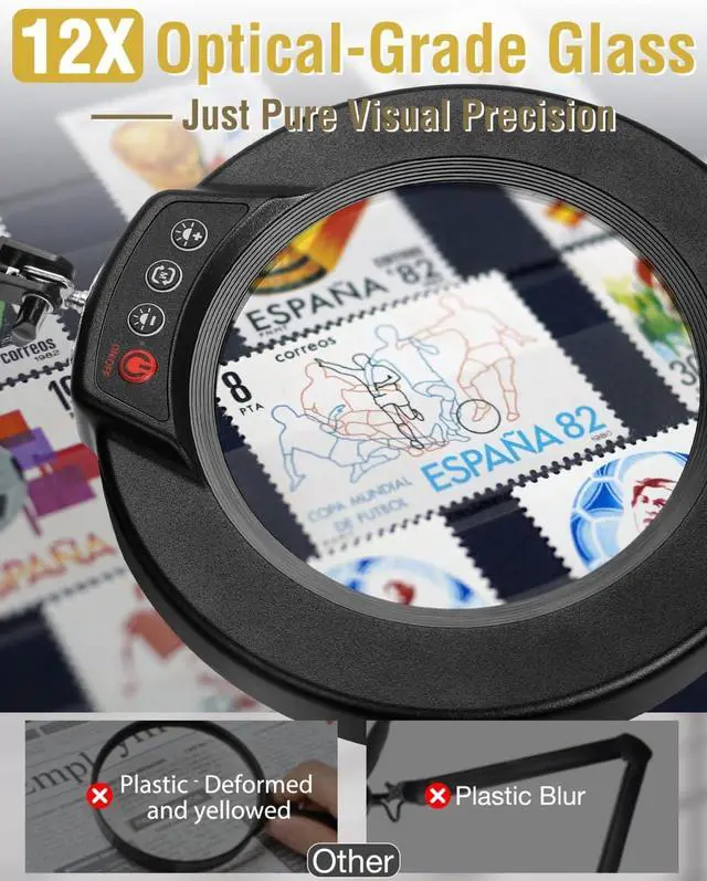 Optical-Grade Glass Lens: This magnifying lamp features a premium 4.3 -inch optical-grade glass lens, delivering 12x magnification with clear, distortion-free viewing. Unlike typical acrylic plastic lenses that may show visual imperfections, this glass lens ensures fine detailslines, stitches, or texturesare easier to see, making it a reliable tool for crafting, electronics, painting, and model building.