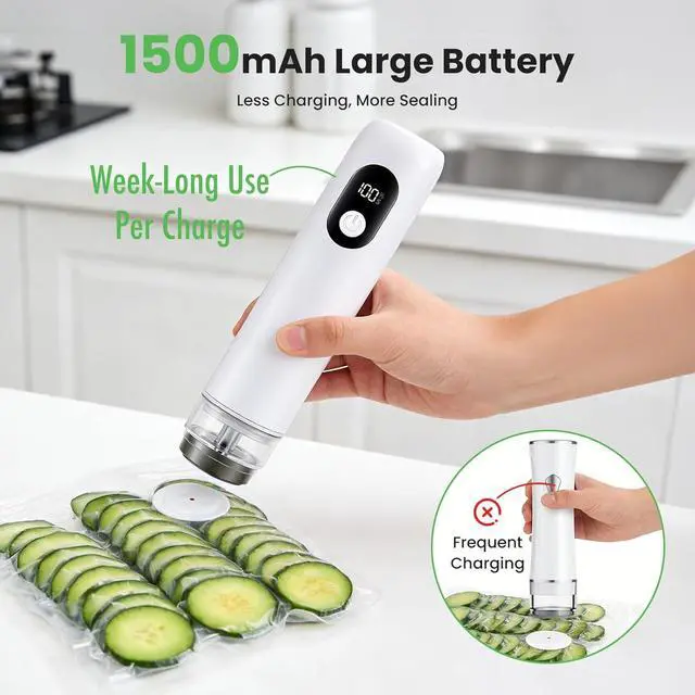 Fast USB-C Charging: Power up with the convenience you expect from modern devices. Equipped with a USB-C charging port, this handheld vacuum sealer can be quickly recharged from your laptop, solar power bank, or car adapter. The built-in 1500mAh battery provides ample power for multiple sealing sessions, so you're always ready to pack up leftovers after a picnic or seal a spontaneous farmers market find.