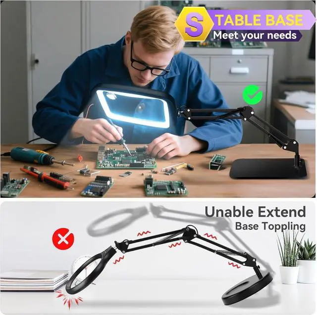 LARGE BASE TO STAY STABLE: Features a large, sturdy rounded rectangle base and covered with protective padding, without any risk of tilting or sliding. The 360° flexible swing arm allows you to easily position the angle and position of the lamp without rebound, allowing you to fully focus on complex tasks, hobbies, making, diamond painting, and sewing