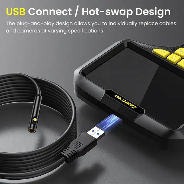 Semi-Rigid 16.5 ft Cable with Hot-Swap FlexibilityNavigate tight, curved, or deep areas effortlessly with the semi-rigid 5m ( 16.5 ft) probe cable. It bends and holds shape for stable, hands-free positioning. The smart detachable