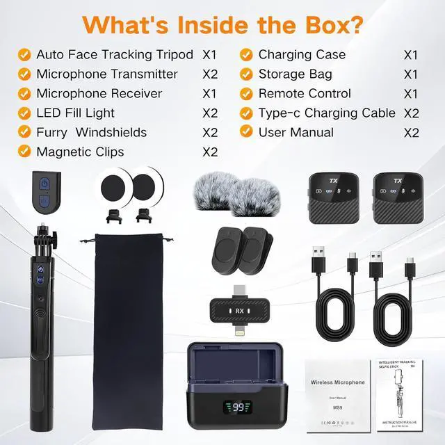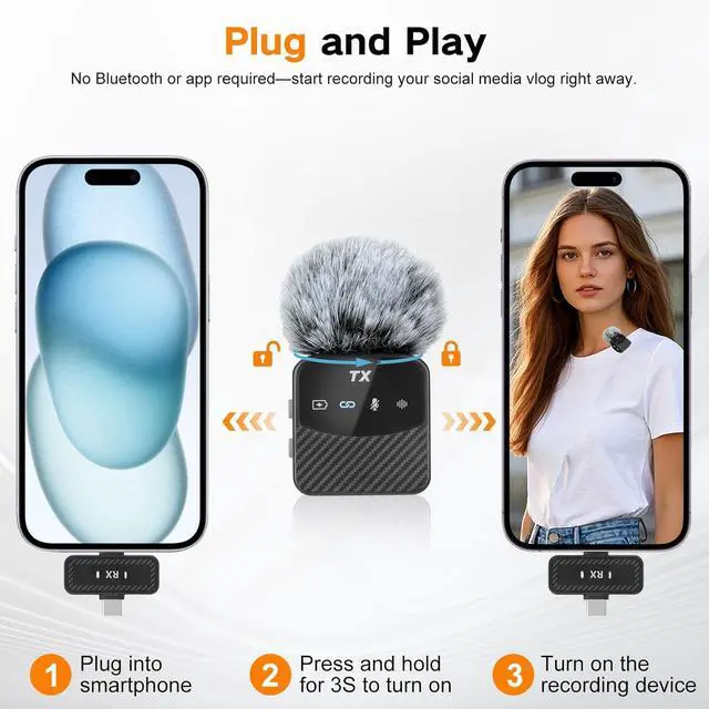 2 in-1 RX Compatible with USB-C Devices and iPhone: 2 IN-1 RX USB-C and Lightning, Our upgraded dual wireless lavalier microphones are compatible with iPhone 17 pro max, Android Phones, iPhone 15(USB-C), iPhone 16, iPad(USB-C), iPhone and more. You can hold the mini lav mic by Magnetic or clip the lapel mic to your shirt. The wireless lavalier mics are suitale for video recording, podcasting, vlogging, tiktok, youtube, instagram, facebook and more.