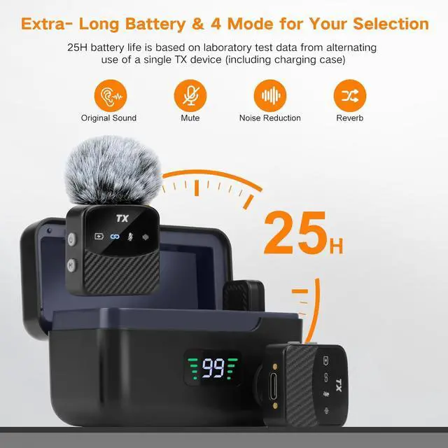 25-Hour Extended Battery Life Microphone: The Type-C lapel microphone paired with its charging case delivers up to 25 hours of battery life. Each microphone provides 5 hours of continuous operation on a single full charge, enabling you to maintain creativity and productivity throughout the day.