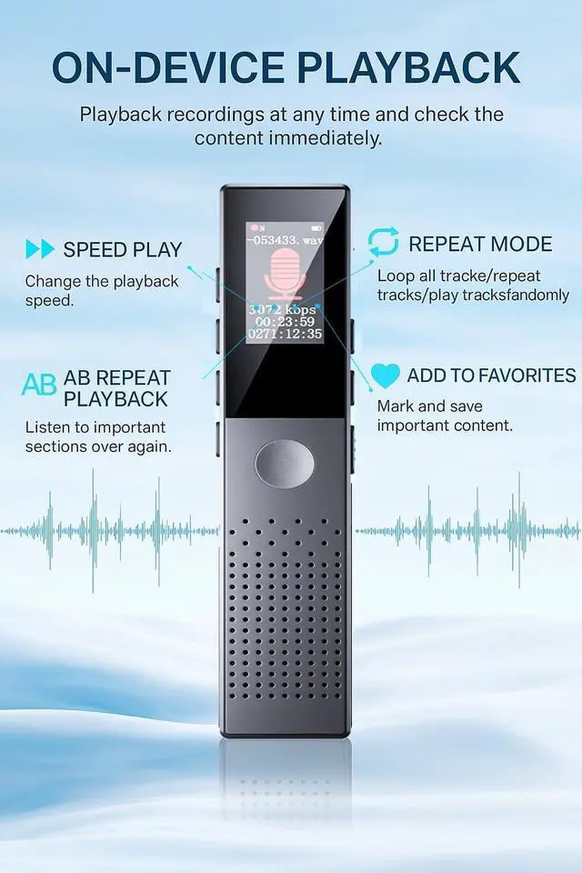 Playback & MP3 Player Function: Instantly playback recordings on the color display or with included earbuds. Enjoy features like A-B repeat, variable speed playback, and add-to-favorites. This digital voice recorder doubles as an MP3 music player for your convenience.