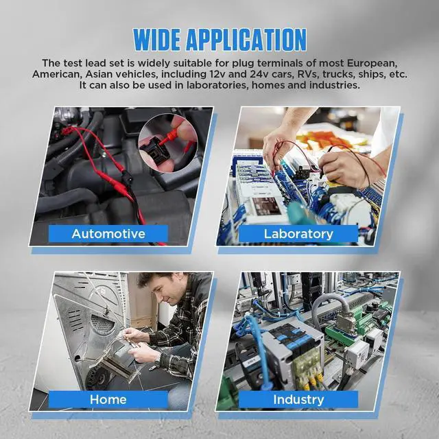 Easy to UseStandard 4mm banana plug, the rear probes can be easily plugged into automotive connectors and used on wiring harness connectors, fuel injectors and automotive sensorsto avoid replacement of unnecessary new parts. but also can be very good with the use of multimeter and oscilloscope and other measuring tools. The use of junction boxes can save manpower and time, great for minimizing damage to connectors and sensors!