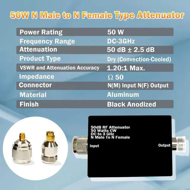 50W RF Attenuator, 50 dB Fixed, 50 Watt 50 Ohm Attenuator DC to 3GHz for Tinysa Ultra Spectrum Analyzer