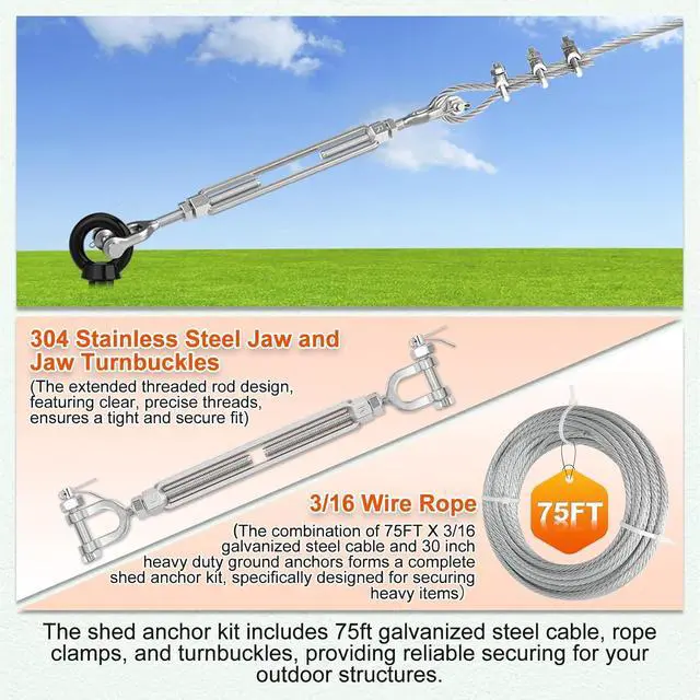 High Quality: The 30" earth anchors are crafted from high-quality steel for heavy-duty use. Double-sided full welding securely attaches the spirals to the shafts. A durable black coating helps prevent rust and corrosion, extending the products service life. Additionally, the 304 stainless steel turnbuckles offer a safe working load of 1, 600 lbs and a breaking strength of 4, 900 lbs