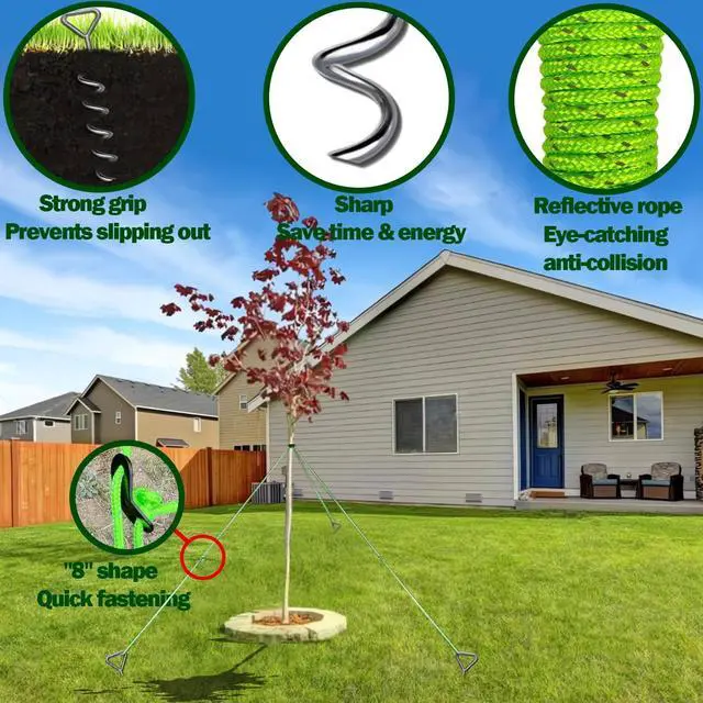 Versatile Applications: Whether for young tree protection, stabilizing tree trunks during hurricanes, or outdoor landscaping beautification, this tree stake kit meets your needs. Its powerful tree support functions are suitable for all types of tree support and fixing. The combination of spiral stakes and reflective nylon support ropes in this kit offers excellent stability, making it an ideal solution for tree stakes and supports for young trees.