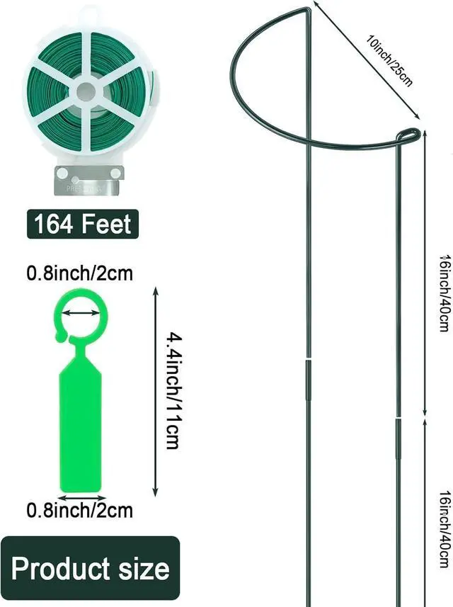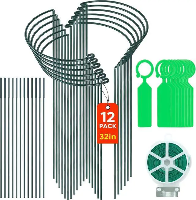 Package includes: 12 pieces 10" wide x 16" high plant support stakes, 24 pieces 16" extension pole and plant label of 20 pcs & plants feet garden twist tie. The Plant ring cage in dark green help it to blend into green plants. You need to install the extension pole on the 16 inch plant support stakes to form a 32 inch plant stakes.