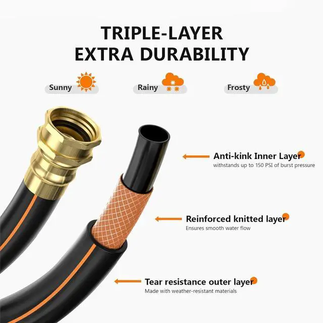 HIGH-GRID GARDEN HOSE: Crafted from a high-performance, weather-resistant hybrid material, the hose of the garden hose reel is leak-proof, offering durability without compromising on elegance. This 1/2 in x 100 ft hose withstands up to 150 PSI of burst pressure, which is a testament to its strength. Designed for seamless, everyday use, this retractable hose complements your home's refined outdoor environment