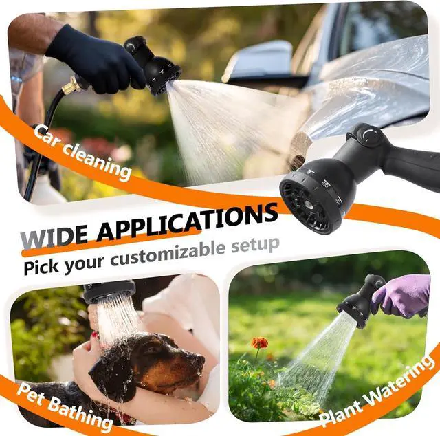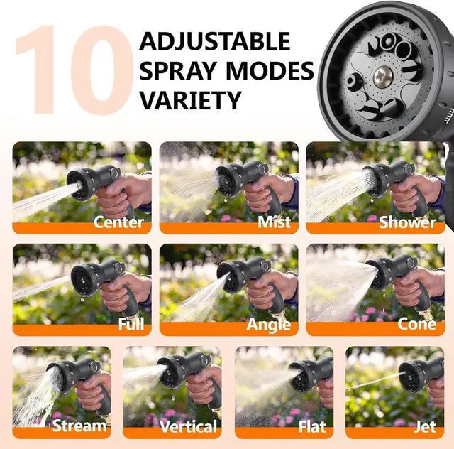 VERSATILE 10-PATTERN NOZZLE: With 10 adjustable spray patterns, this garden hose reel provides versatility for a range of tasks: washing the car, watering delicate flowers, cleaning, pet bathing, and more. The intuitive design of our water hose reel allows you to effortlessly switch between modes, offering a harmonious balance of performance and simplicity for any outdoor activity
