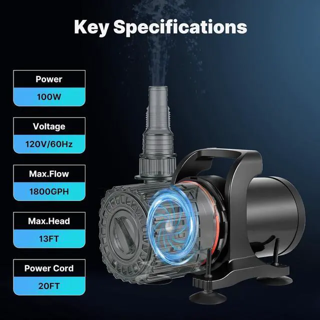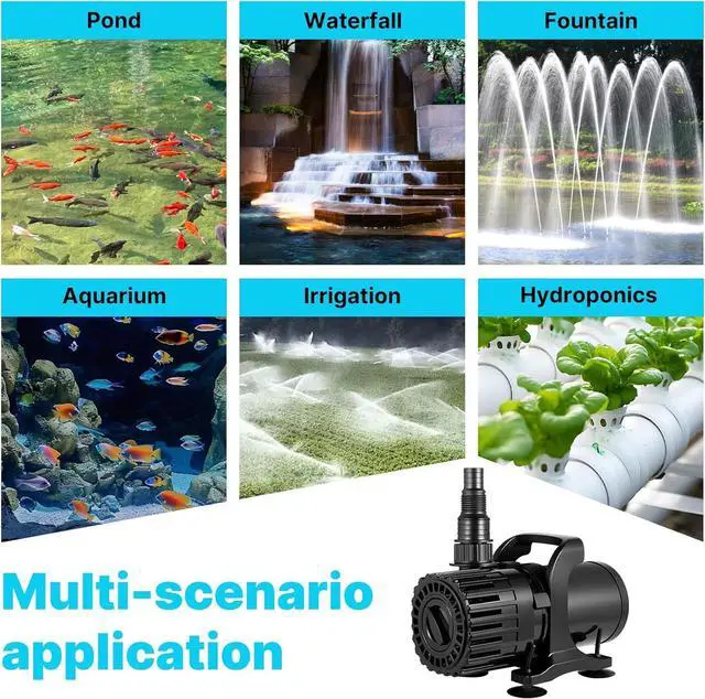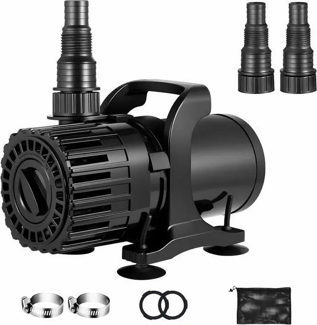 EASY SETUP & FLEXIBLE PLACEMENT: Includes two outlet nozzles for multiple pipe sizes, suction cups for stability, and a portable handle for easier placement. A 20-foot power cord allows flexible positioning farther from outletsideal for backyard water gardens and pond layouts.