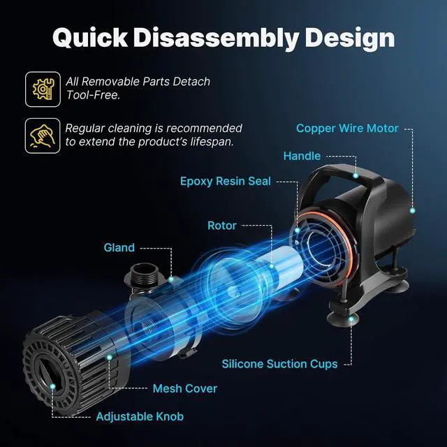 TOOL-FREE MAINTENANCE: The mesh cover, impeller housing, and rotor are easily removable without tools for quick inspection and cleaning. Regular maintenance helps maintain steady flow in water feature pump setups.