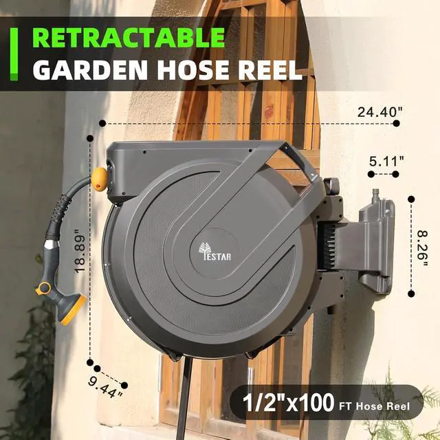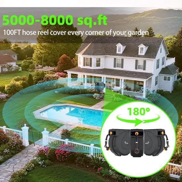 180° Rotating Bracket & 100-foot Wide Area CoverageIntegrated 180° rotatable bracket adapts to any angle. The 1/2-inch diameter retractable hose (100ft/30m) covers 5, 000-8, 000 sq ft ( 5.6 courts) from one point easily irrigating ¼-acre gardens. This water hose reel reduces movement needs by 40% and eliminates dead zones.