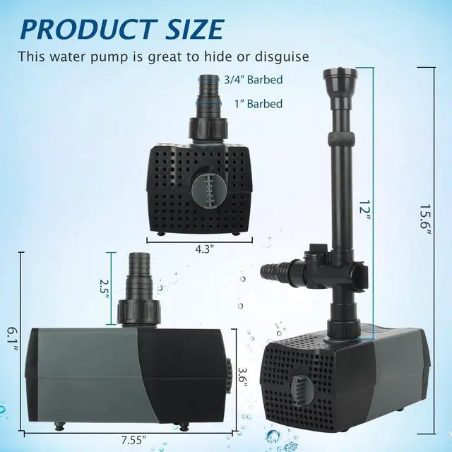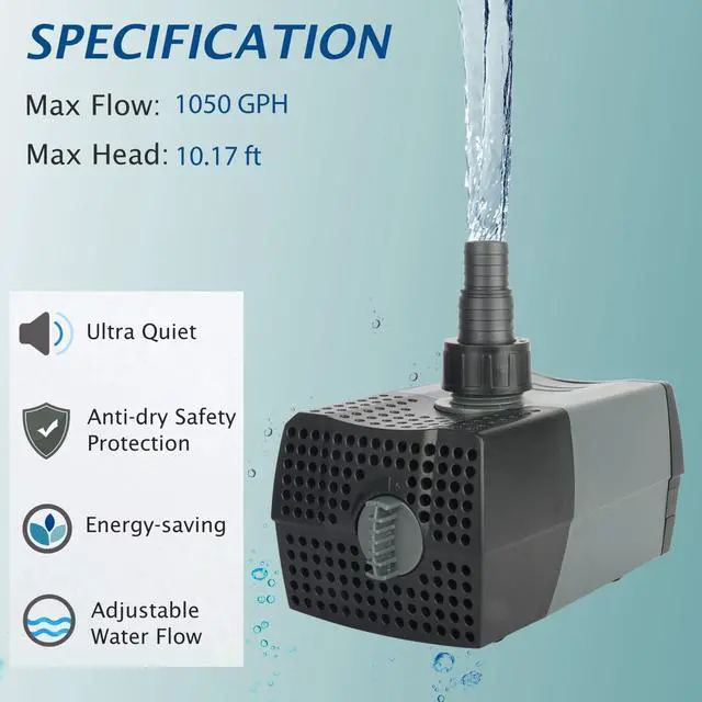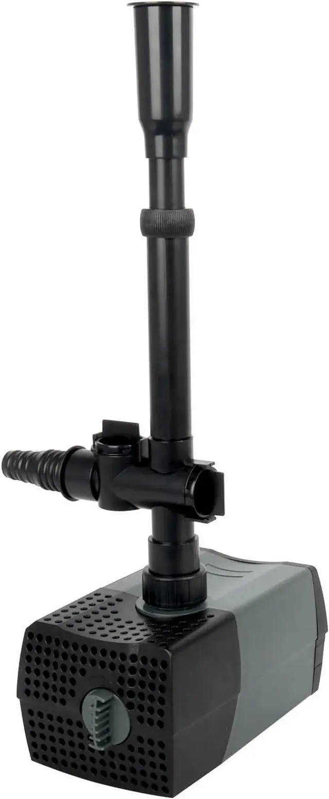 Adjustable water flow knob on the front case and on the fountain assembly Adjustable fountain size by regulating fountain jet Hose nozzles- 90 degree rotatable front intake enable low suction water level