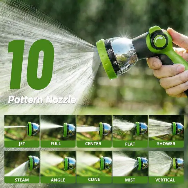10 Spray Patterns: Multi-functional nozzle features 10 precision spray modes (Mist, Jet, Shower, Flat, Soaker, etc. ), tailored