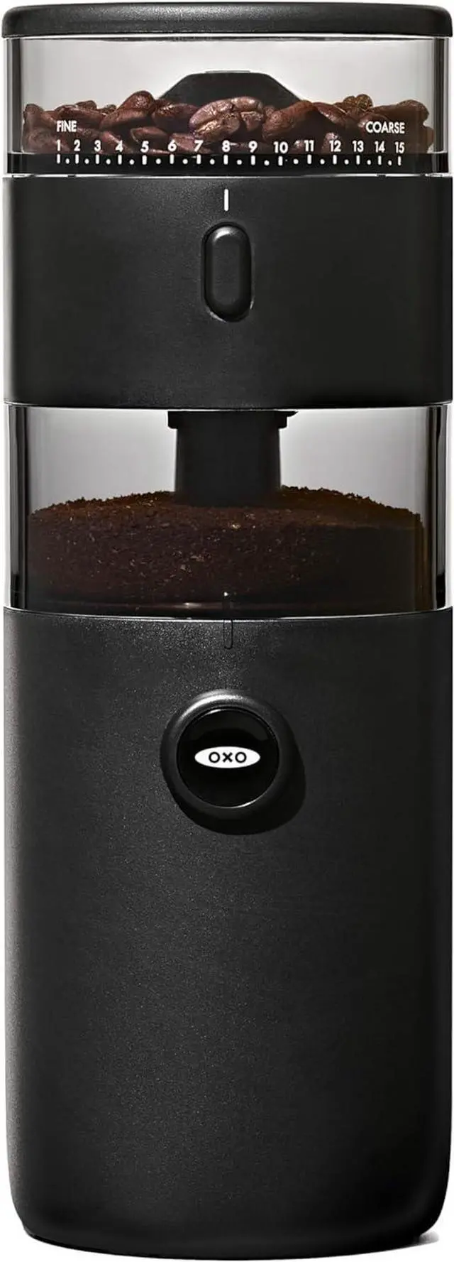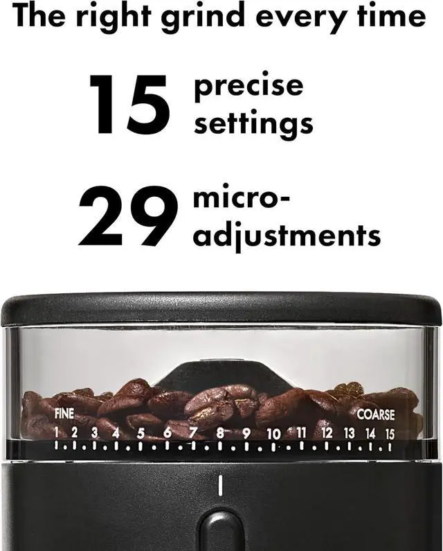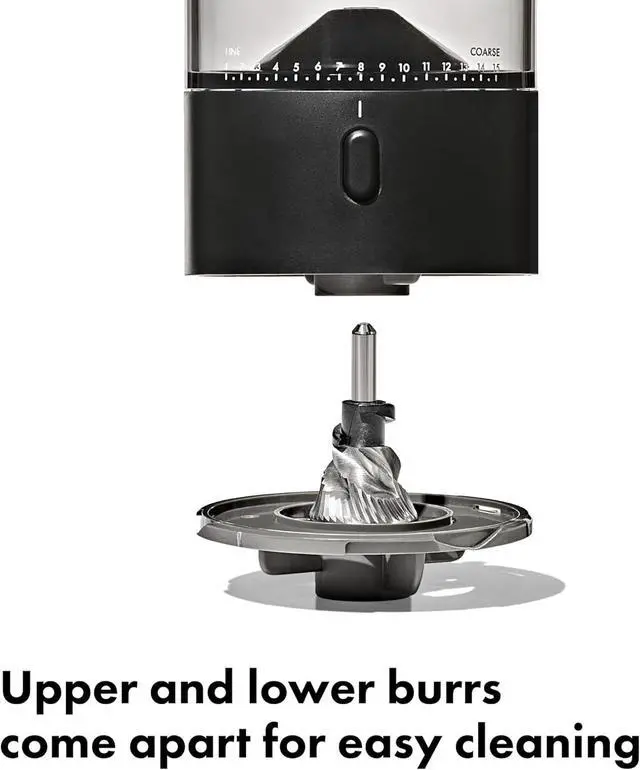 The Brew Compact Conical Burr Coffee Grinder delivers the power of a full-size electric grinder without the bulk. Choose from 15 settings and 29 micro-adjustments to get your perfect grind time after time. The stainless steel conical burrs ensure a consistent, high-quality grind, critical to maximizing flavor. The hopper holds up to 50 grams of coffee beans, perfect for making up to 6 cups or 30 ounces of brewed coffee. The grinds container features an integrated spout for neatly pouring grounds. The grinders upper and lower burrs come apart for easy cleaning, and the chuteless design makes the grinder itself easy to reach and clean.