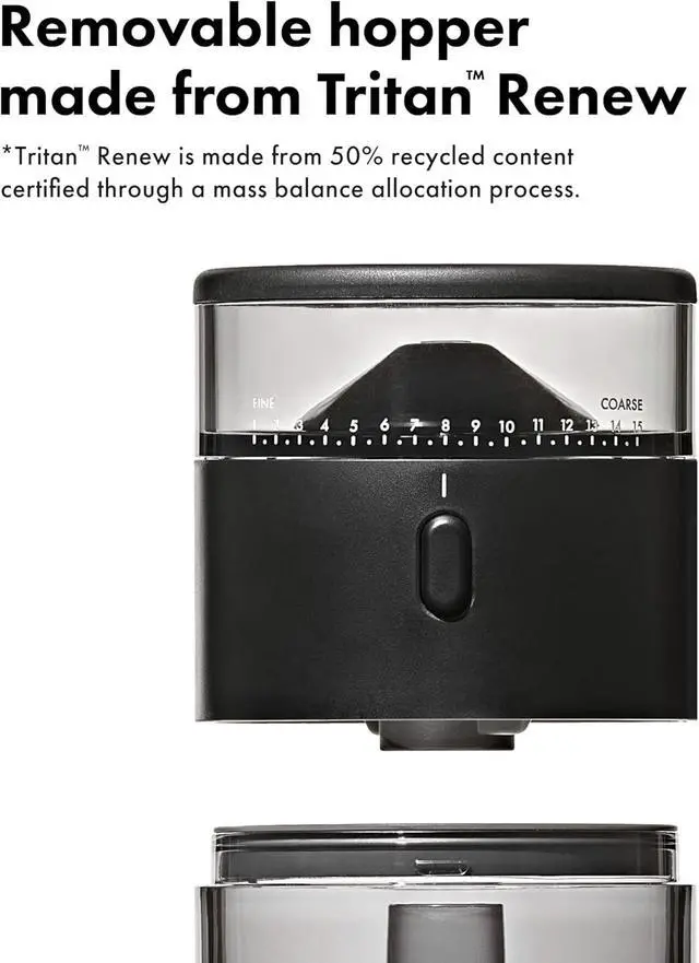 Hopper and grounds container made from Tritan renew, which is made from certified recycled content through a mass balance allocation process that transforms plastics destined for landfills into high-performance, food-safe materials