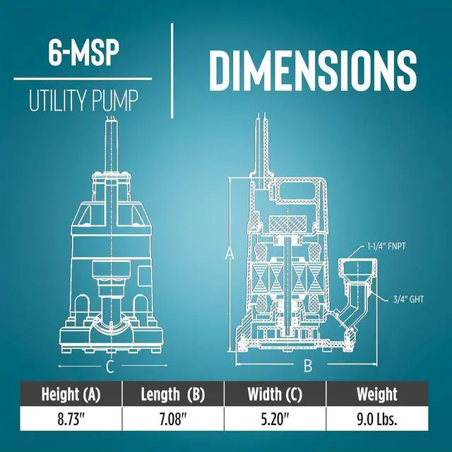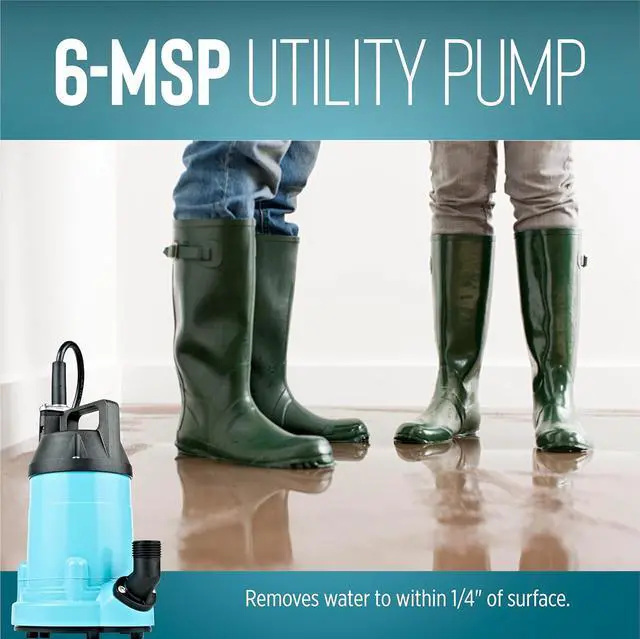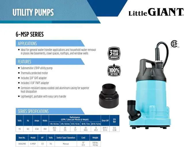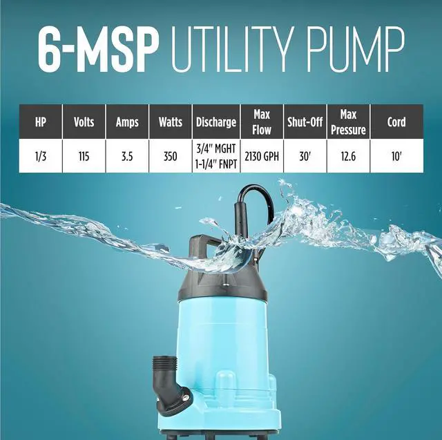 The 6-MSP is a submersible, manual, 1/3 HP, 115-Volt aluminum utility pump capable of delivering up to 2130 GPH at 1-ft. lift. Ideal for water transfer or removal in and around the home including flood water removal. It comes equipped with a 3/4-inch garden hose discharge and a 1-1/4-inch FNPT adapter. This pump is equipped with a 10-ft. power cord.