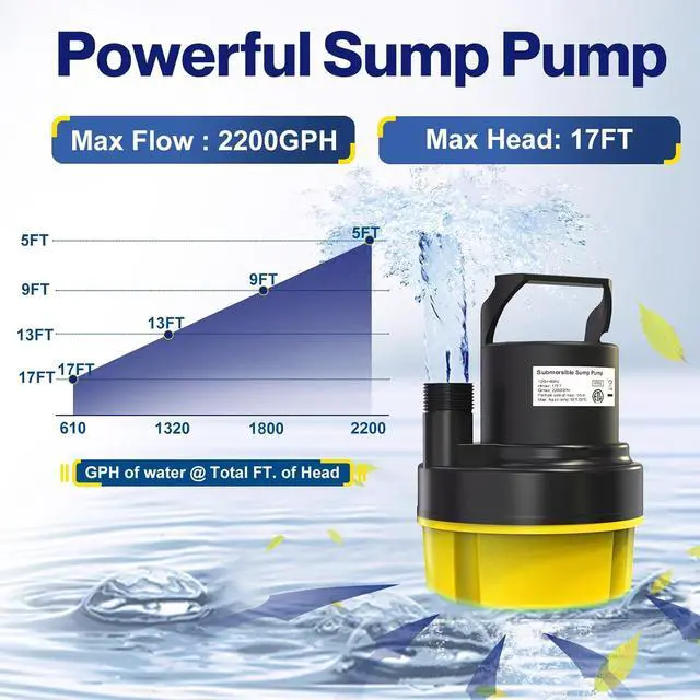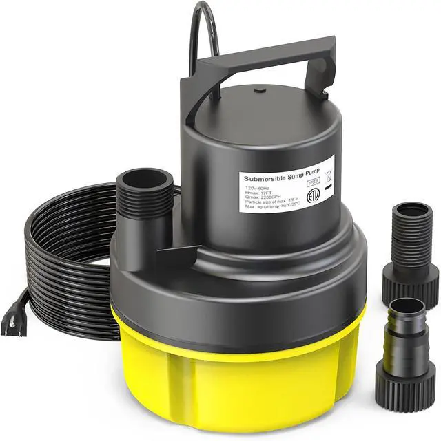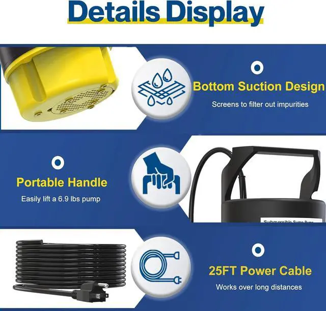 Fully Functional Submersible Pump: submersible sump pump boasts a minimal 1/5-inch suction distance. This water pump for pool draining starts running the moment it's plugged in. Designed for fully immersed use, protective bottom of this utility pump shield acts as a barrier, effectively preventing leaves and debris from entering the submersible water pump body.