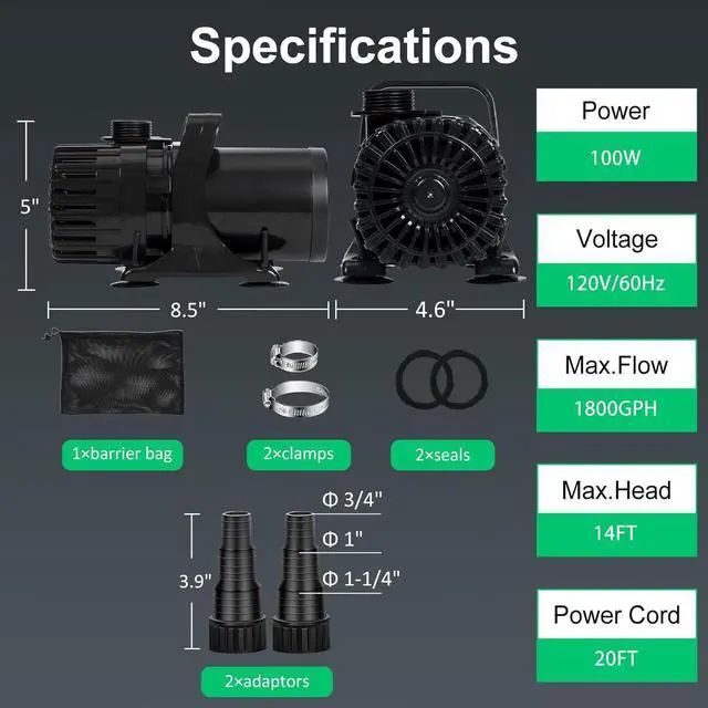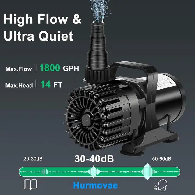 EASY SETUP & FLEXIBLE PLACEMENT: Includes two outlet nozzles for different pipe sizes, suction cups for stability, and a portable handle for easy placement. A 20-foot power cord allows flexible positioning for backyard water gardens and pond layouts.