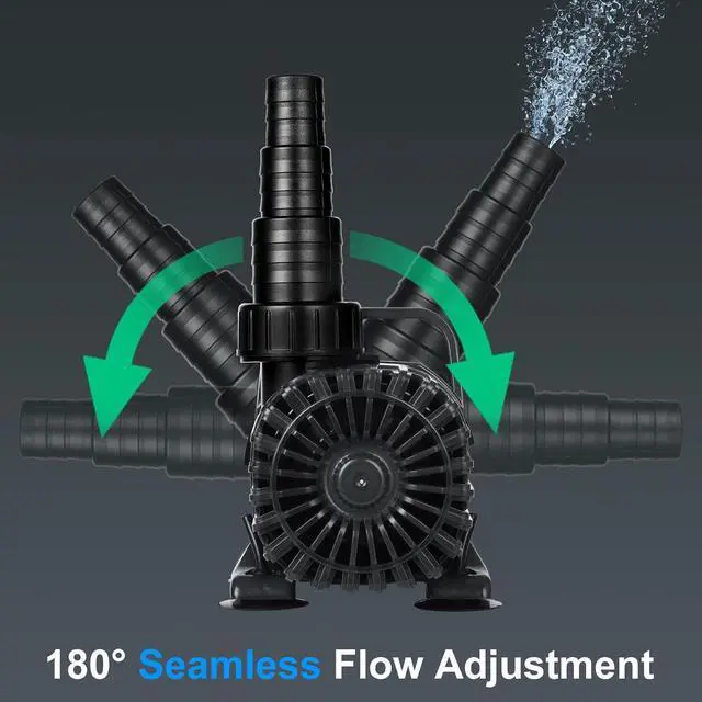 SMOOTH FLOW & DUAL FILTER DESIGN: The 180° seamless adjustable outlet allows precise water direction. A mesh cover plus nylon barrier bag forms a dual-layer filtration system that prevents debris from slowing water flow or clogging, supporting fountain pump and waterfall pump applications.