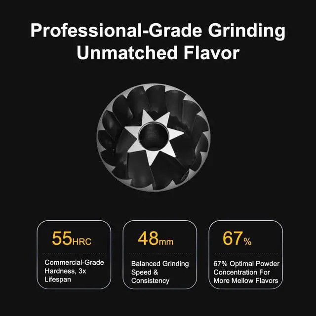 Professional 55HRC Steel Burr Precision for Any BrewThe heart of this stainless steel burr grinder is its professional-grade conical burr set, hardened to 55HRC and 7-axis CNC machined. It delivers uniform particle distribution essential for optimal extractionwhether you're using it as an espresso grinder, pour over grinder, or for cold brew. This coffee bean grinder minimizes bitter fines to unlock the full flavor of your specialty beanstrusted by outdoor baristas and home enthusiasts alike.