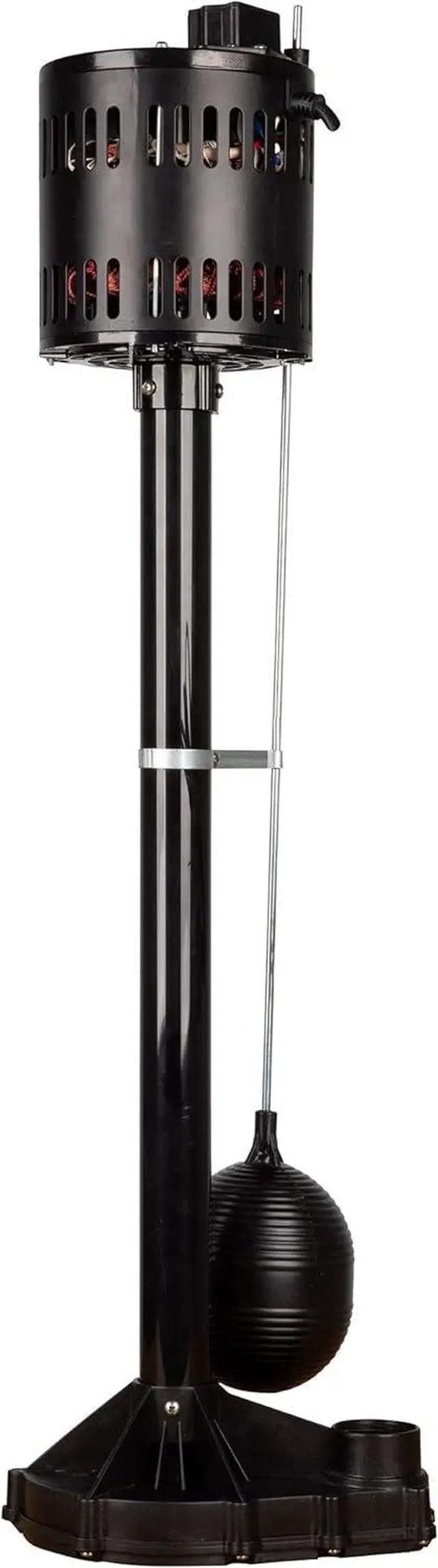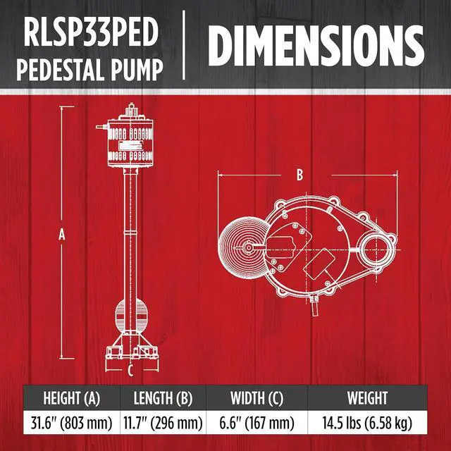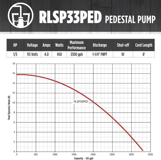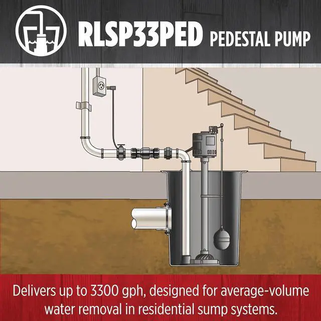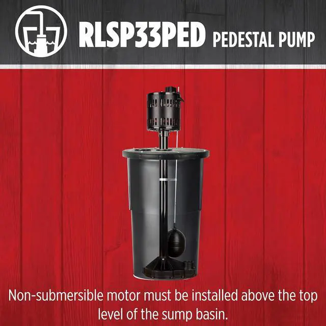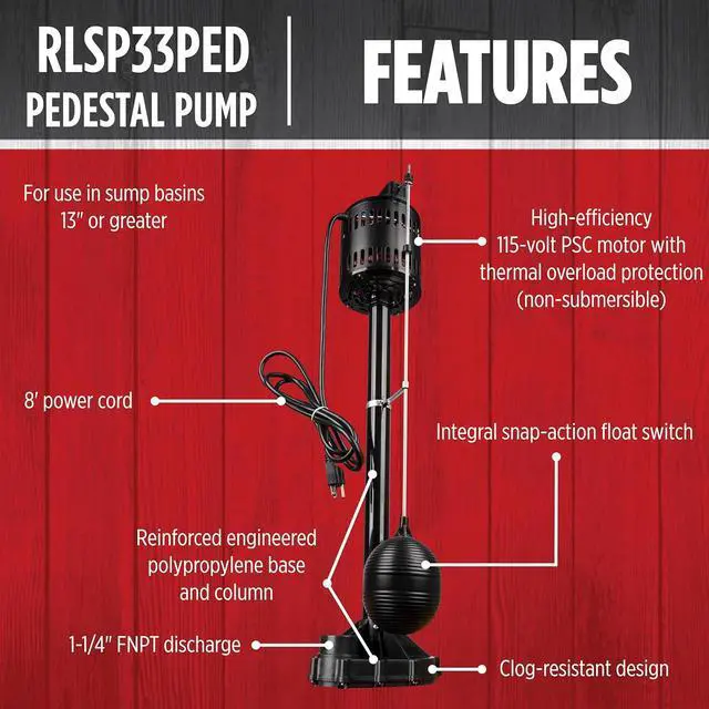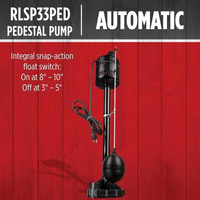 The RLSP33PED (14942052) 115 Volt, 1/3 HP pedestal sump pump delivers up to 3300 gallons per hour suitable for average home in North America. The reinforced engineered polypropylene construction is rust-resistant. The adjustable snap-action float switch activates the pump when water reaches 8 to 10 inches and automatically shuts the pump off when water falls between 3 and 5 inches. This pump is equipped with a 1-1/4-inch discharge and an 8-foot cord. The RLSP33PED fits in basins 13 inches or larger.