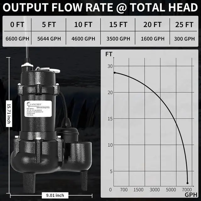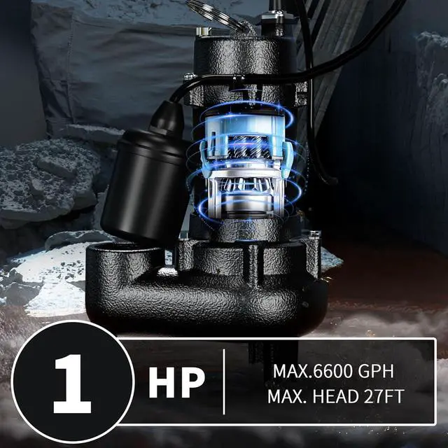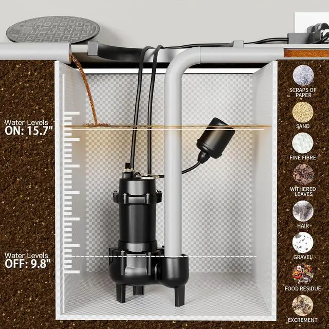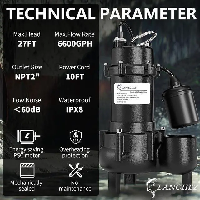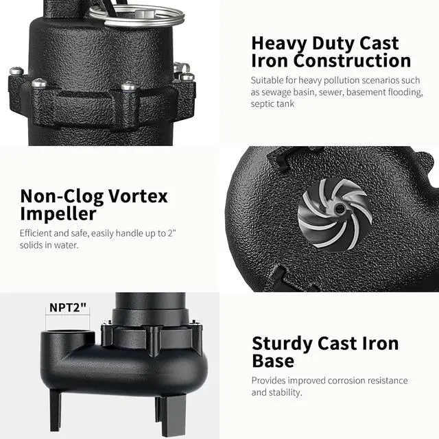 [WIDE APPLICATION] 10ft extended length grounded waterproof power cord with portable handle for easy installation from farther locations. 2" NPT discharge for high capacity pumping. Ideal for residential and commercial sewage & dewatering, such as sewage system, waste water drainage, sewer and basement flooding