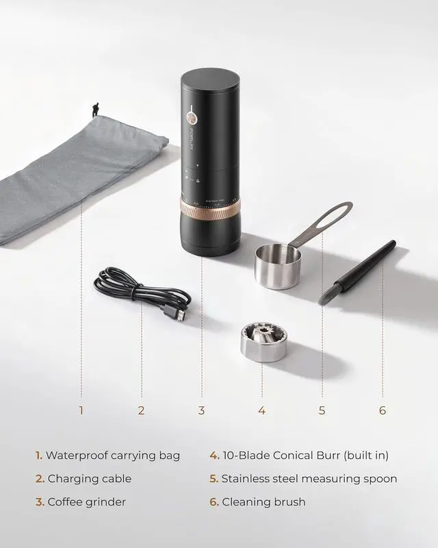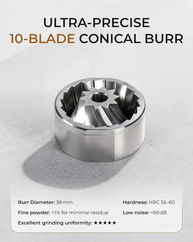 Advanced 10-Blade Burrs: This coffee bean grinder features hardened SUS420 steel burrs that ensure fast, uniform grinding with minimal heat buildup. The result is a balanced extraction that unlocks the full, rich aroma and flavor of your beans, ideal for any brewing method.