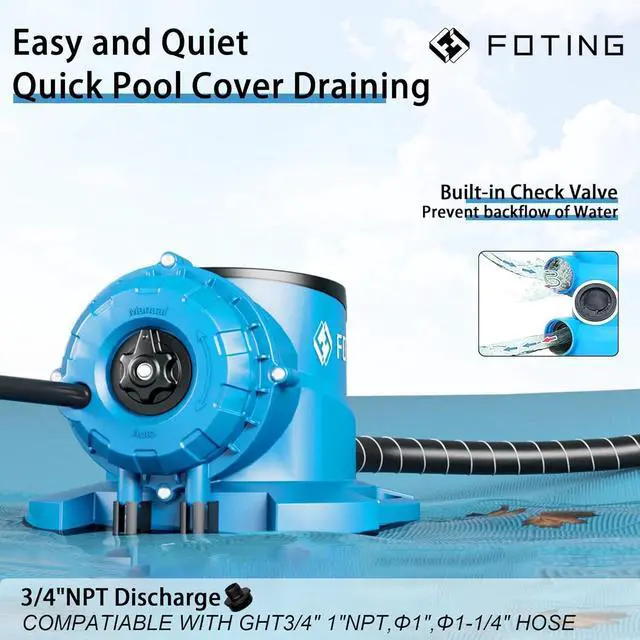 PORTABLE UTILITY PUMP: 1-1/4 NPT vent and 3/4 garden hose adapter with check valve maximize flexibility and safety. Submersible pumps are equipped with a filter base to protect the pool cover and filter debris, providing maximum stability during operation. This sump pump is easy to clean without tools or screws.