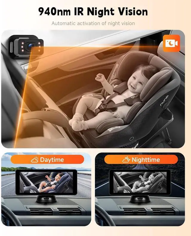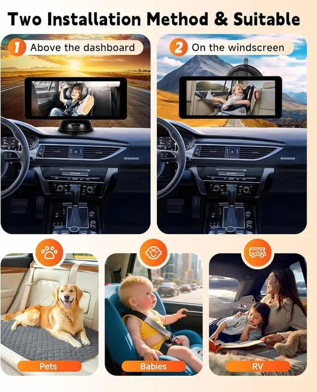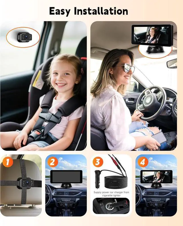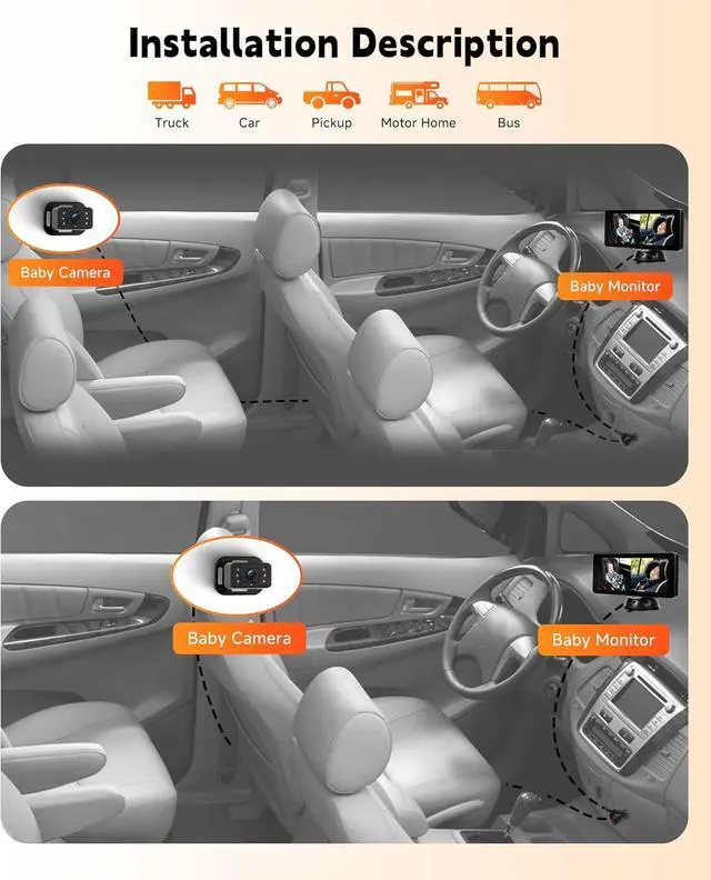 Easy Installation & Universal FitInstall this rearview infant car camera in minutes without toolssimply strap it to the headrest, plug into your car's 12V power port, mount the LCD monitor, and adjust. Compatible with most cars, trucks, vans, and SUVs.