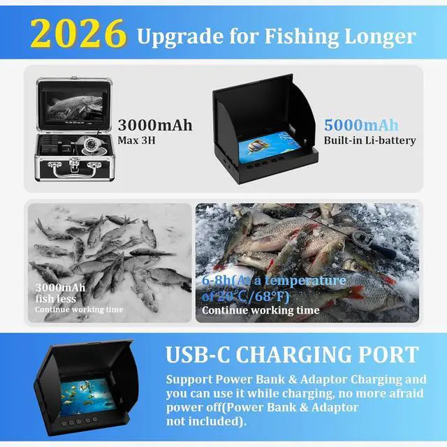 5000mAh Large Capacity Battery: This visual fish finder has a built-in 5000mAh battery, which is charged using a USB charging port. It can be used continuously for 8-9 hours when fully charged. The display can also be charged via a mobile power supply or adapter, which is convenient for outdoor use.